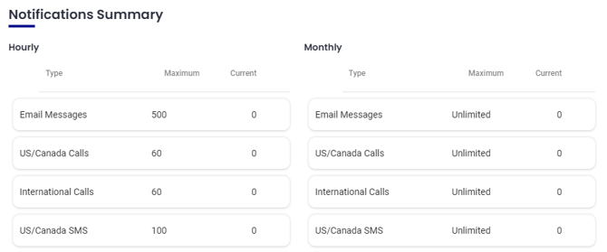 Notifications Summary displays hourly and monthly notification limits for this account categorized by notification type.