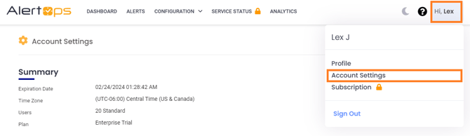 From the AlertOps web application, navigate to Account Settings from the top right-hand side of the screen and click Account Settings.
