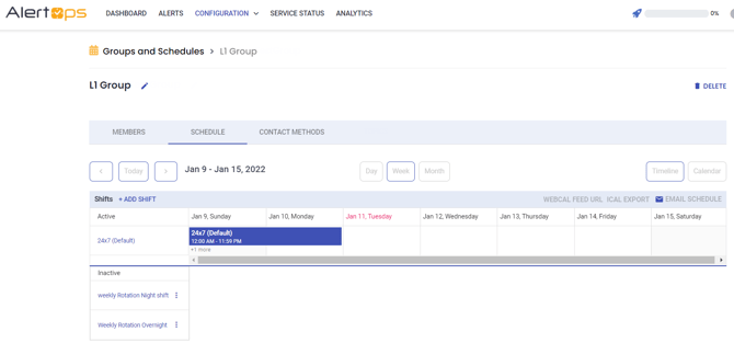 Add a schedule to a group and view group calendars from the Groups & Schedules Management page. Groups can contain multiple schedules including fixed and rotating schedules.