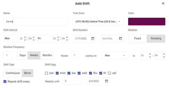 - Select a Shift Interval and Shift Duration to set start and end the schedule shift.