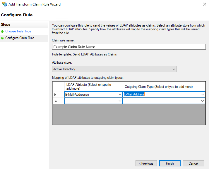 - Under Mapping select E-mail Address on both LDAP Attribute and Outgoing Claim type