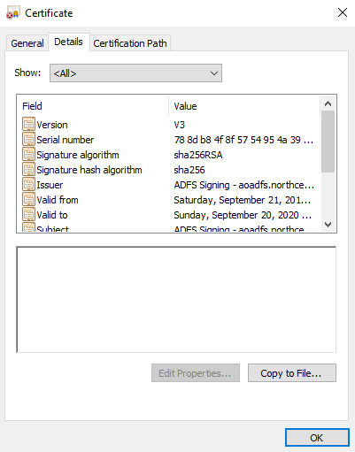- Go to Certificates in Service, right click on the Token-signing certificate and click View Certificate.