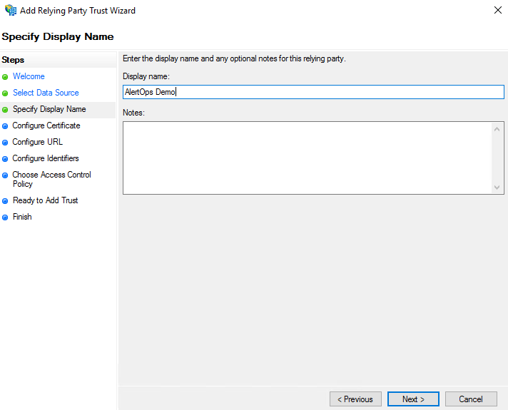 - For Relying party trust identifier, paste your AlertOps domain URL and then click the Add button.