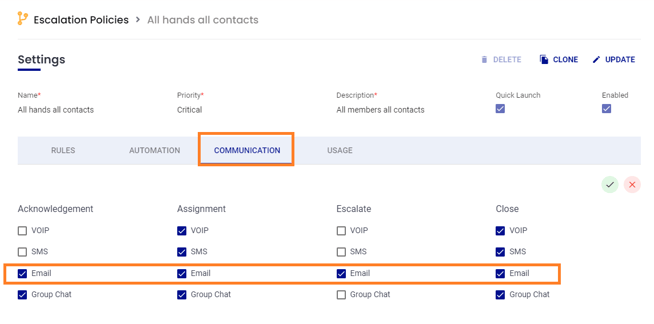 In the image above, the Acknowledge and Escalate buttons have been suppressed. Action buttons that appear for an alert are configured in the Communications tab of the Escalation Policy.