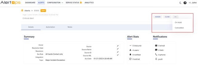 Users can make changes to the alert status and take actions from the alert detail page.