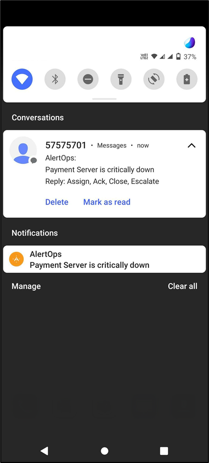 Users can receive and respond to alerts through different channels: Phone, SMS, Email, AlertOps Mobile App, or chat applications like Slack and Microsoft Teams. Response options are enabled in the Escalation Policy, allowing action buttons to be displayed or hidden for each communication channel.