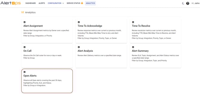 The Open Alerts Report displays alerts that are currently open. Users can drill down on sets of open alerts which are categorized.