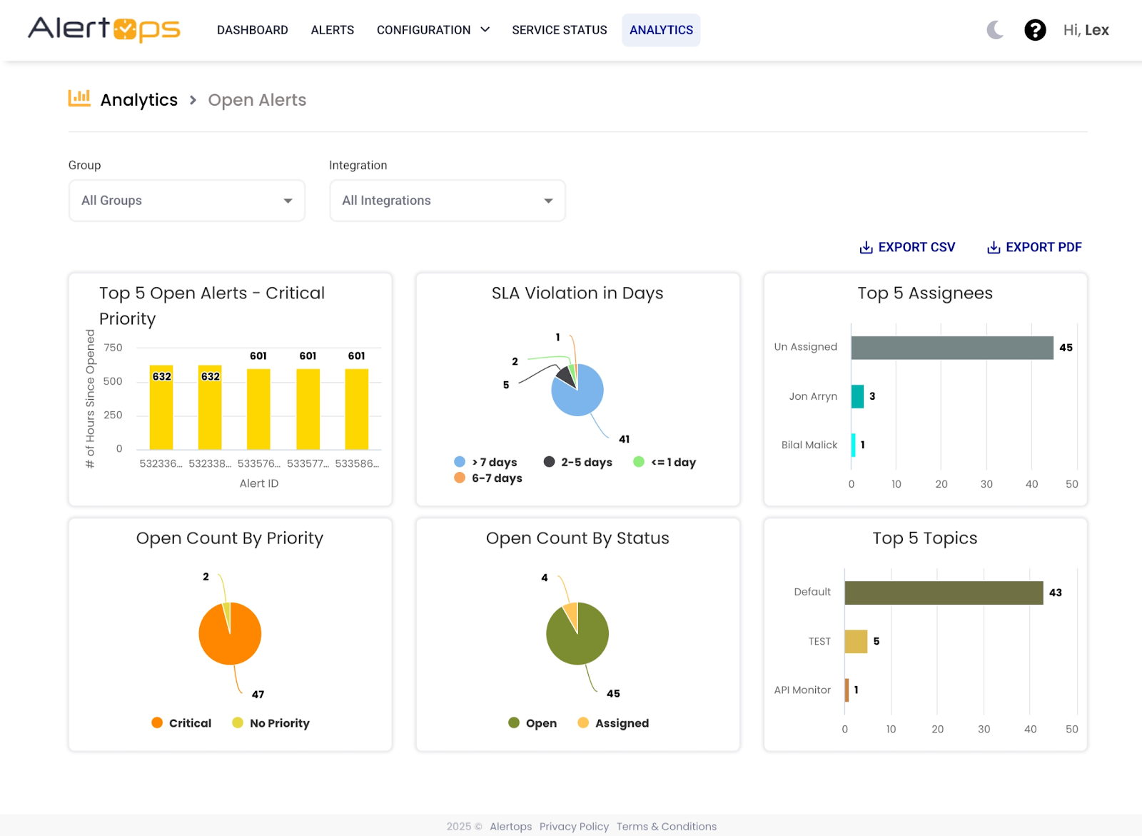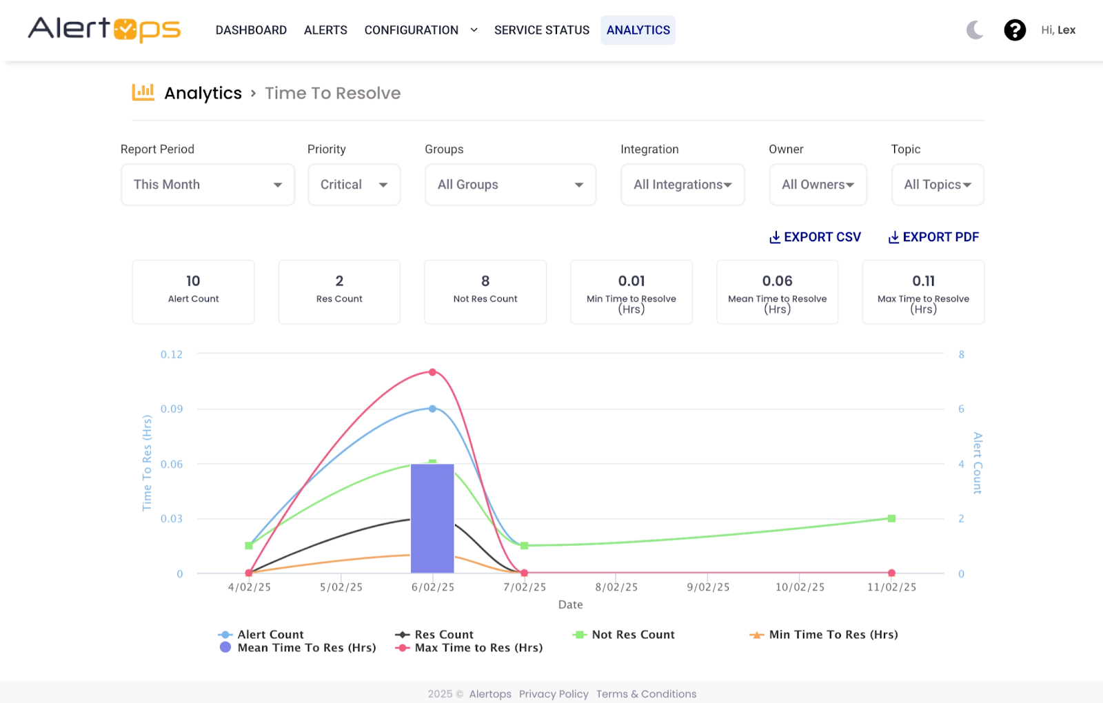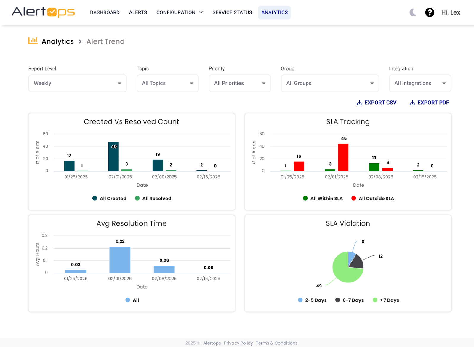 All reports in AlertOps allow for export in CSV or PDF formats for further analysis. The ability to filter by different criteria ensures that teams can focus on the most relevant data for their operational needs. By leveraging these reports, organizations can enhance response times, improve SLA adherence, and optimize their on-call and resolution workflows.