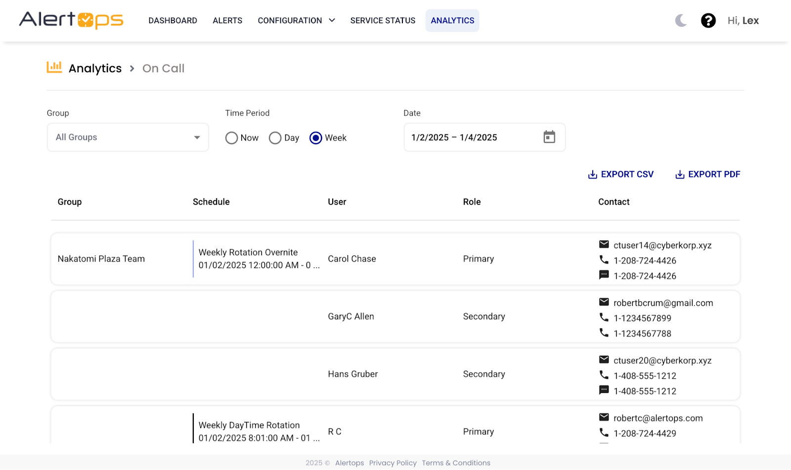 - Export Options: Users can download the on-call schedule as a CSV or PDF file.