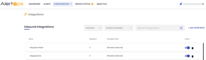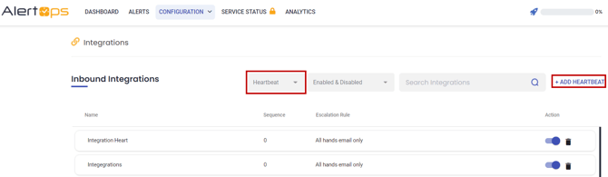 Go to Configuration > Integrations > Select 'Heartbeat' from the drop down in AlertOps.