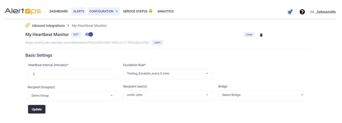 Enter a unique integration name, a Hearbeat interval in minutes, select the Escalation Rule to deliver the alert when the heartbeat has missed an interval check, finally, enter the Group(s) or User(s) to be notified when there is a missed interval. Click Save. Copy the API URL, this is the endpoint to which heartbeat alerts must be sent..png?width=670&height=242&name=image-1639565848022(1).png)