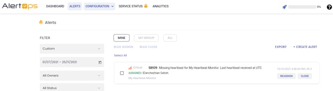 AlertOps heartbeat Monitoring allows customers to listen for a signal or ‘hearbeat’ from an external source. When the heartbeat is interrupted for a specified period, an alert may be sent to a person or team. Only one alert will be sent for a Heartbeat alert. When heartbeat pulses have resumed for an open alert, the alert will be closed automatically. You can create multiple Heartbeat Monitors, each one will be tracked separately.