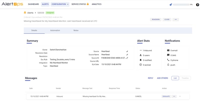 Heartbeat alert notifications will be sent according to the Escalation Rule.