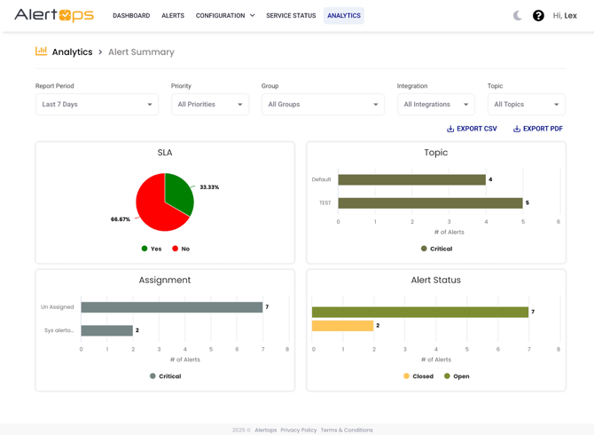 - Alert Summary: Displays a high-level overview of key alert metrics, including SLA adherence, assignment distribution, alert status, and alert topics.