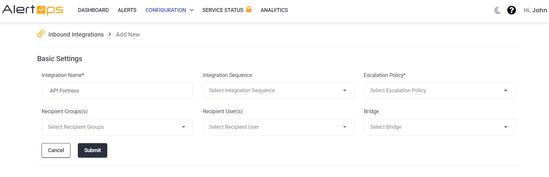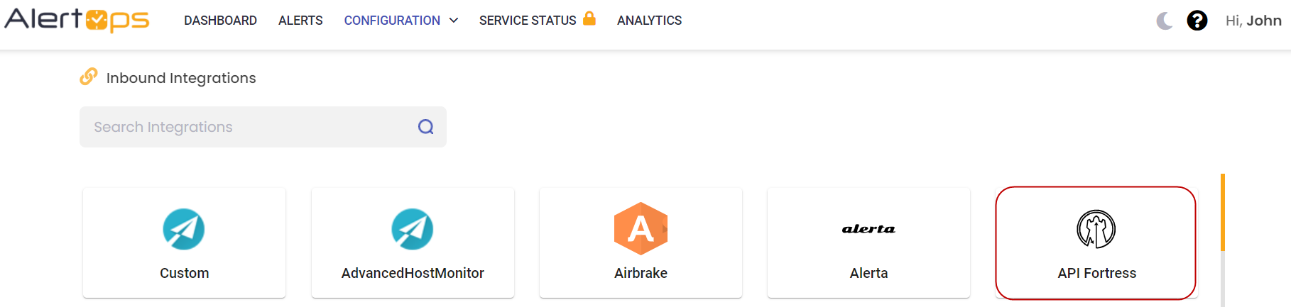 To configure an Inbound Integration in AlertOps to receive alerts from API Fortress: