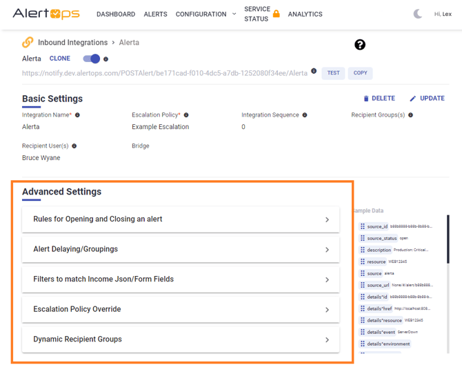 At the bottom of an Integration page, you will find an expandable list of Advanced Settings where you can make additional configurations for an integration. Depending on your AlertOps package, you may not have access to all of the options below: