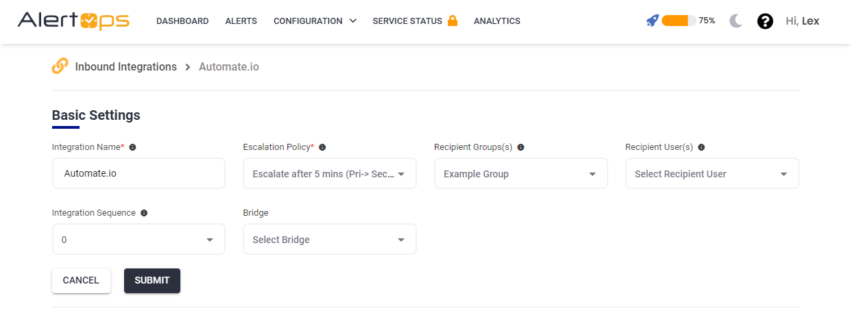 - Once you selected the integration, you can then specify basic settings like the integration name, escalation policy, names of the recipients/groups for which the alerts must be assigned to.