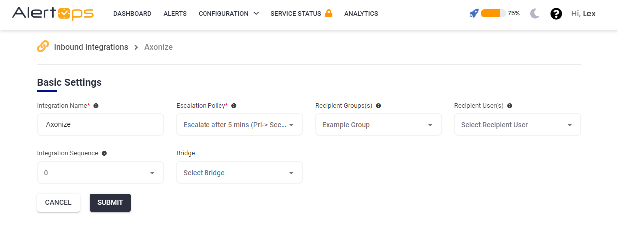 - Once you selected the integration, you can then specify basic settings like the integration name, escalation policy, names of the recipients/groups for which the alerts must be assigned to.