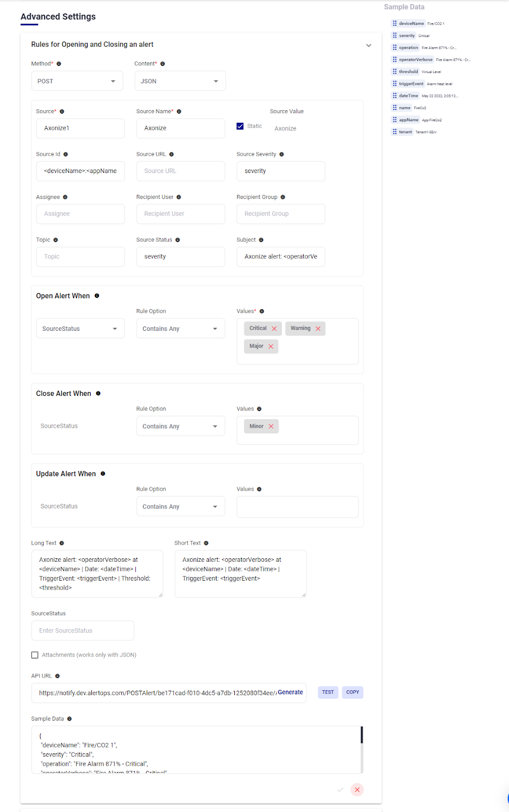 - Make a note of the API URL, which will be used in Axonize, so it calls a HTTP POST request to this URL with the body in JSON format containing the alert specific information. AlertOps automatically creates an alert when the status variable (severity) contains 'Critical/Warning/Major'. The incident will also be closed automatically when the status 'Minor' is received from Axonize.