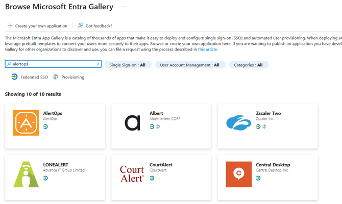 - From this screen, search AlertOps from the gallery. Select the AlertOps icon from the search results.