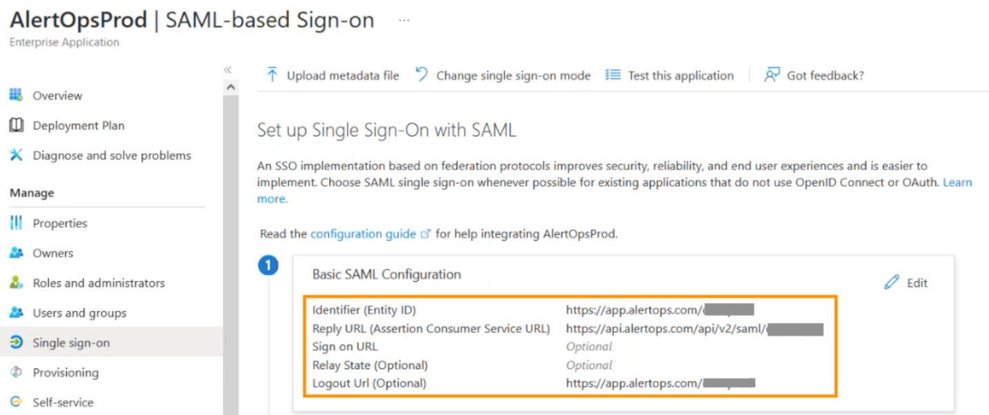 - Click Single sign-on from the Getting Started tiles or use the menu on the left to navigate to Set up single sign on. In the resultant configurations screen, click the pencil edit icon on Basic SAML Configuration and enter and save the following based on your AlertOps client URL: