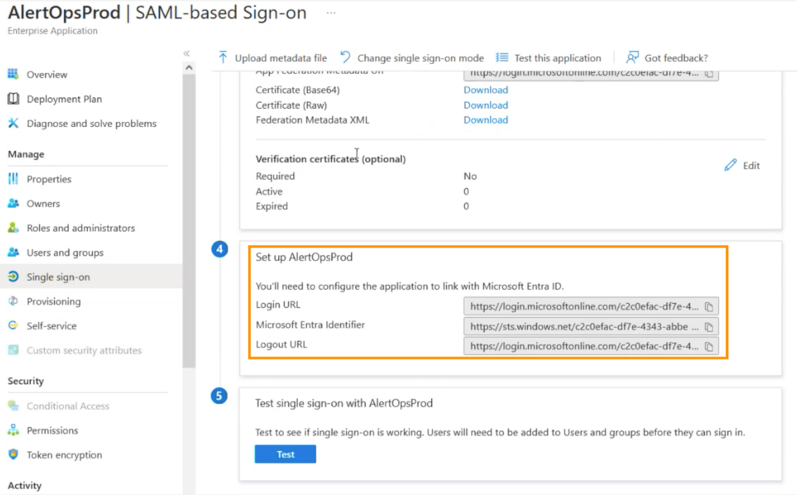 - Scroll down and make note of step 4. Here you will find your URLS to be used in your AlertOps environment. Both the login URL and Logout URL are the same, so copy one to use later.