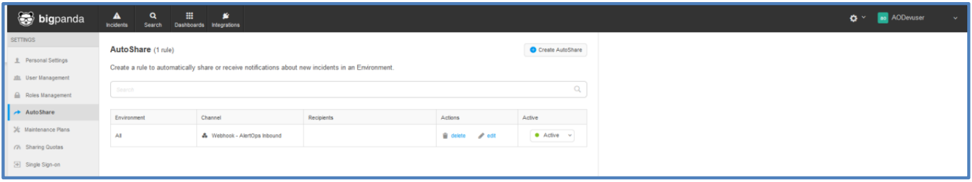 - Click Next, you can enter a message to be sent through this AutoShare option (something like “AlertOps-BigPanda Incident: <>”) – Click Create. Make sure the ‘Active’ state is toggled on.