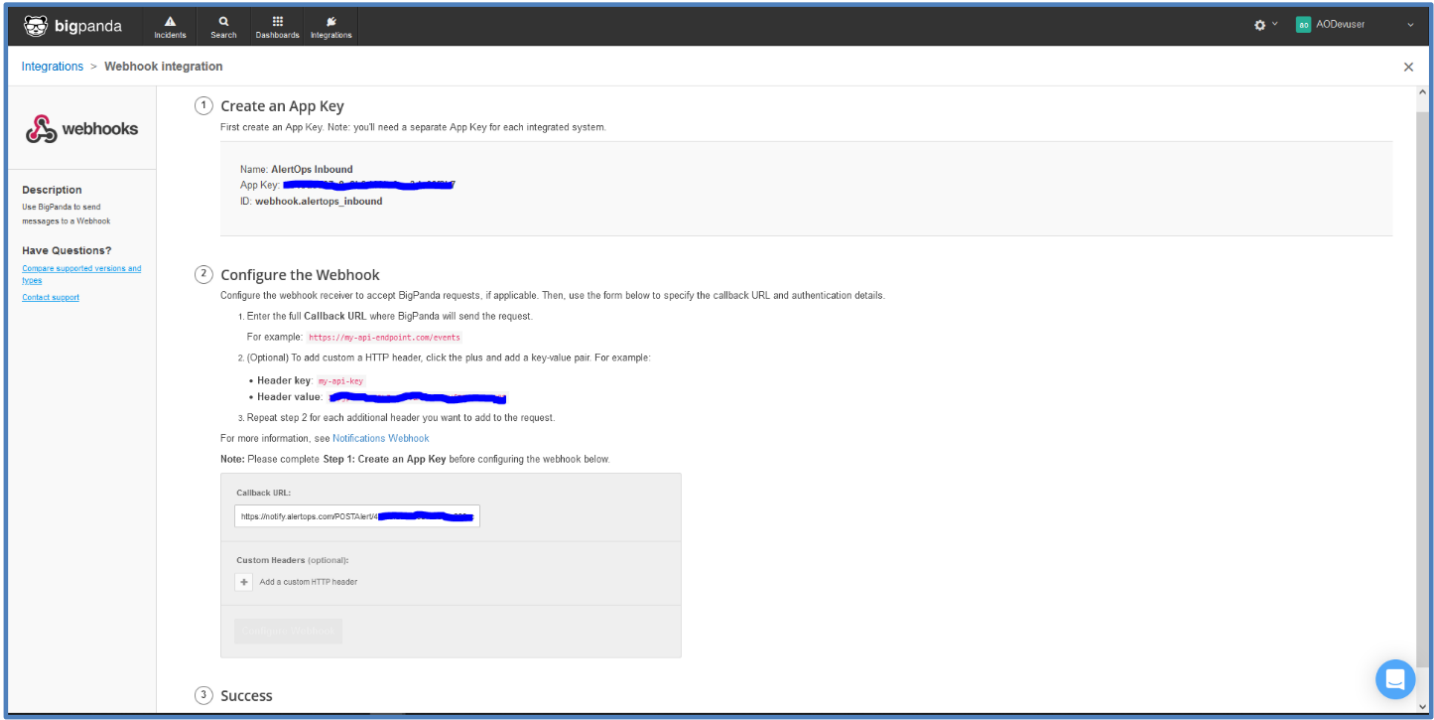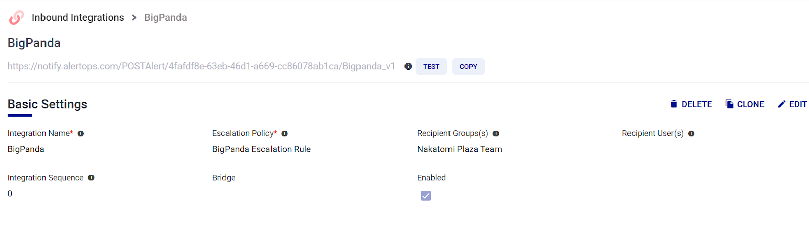 - On clicking Submit, the API Integration will be created, and you will be given a unique URL which acts the access point and needs to be configured at the source (in this case BigPanda), to send alerts. You can find the integration you just created, and you can give advanced settings and define various configurations for the alerts to be received and processed. For example, you can define when to open and close alerts based on the response obtained from the API call, filters etc.