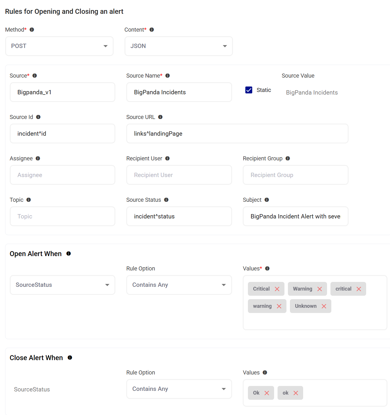 - Make a note of the API URL, which will be used in BigPanda, so it calls a HTTP POST request to this URL with the body in JSON format containing the alert specific information. AlertOps automatically creates an alert when the 4 status variable (incident^status) contains the below specified values (as per the definition in the screenshot above). The incident will also be closed automatically when the status ‘Ok’ is received.