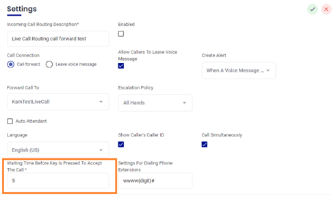 Enter a Waiting Time (In Seconds) Before Key Is Pressed To Accept The Call. Here you will specify the waiting time (in seconds) before pressing a key to accept the call. This delay determines how long to wait before moving to the next team member if the first attempt goes unanswered.