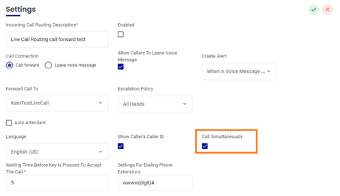 Check Call Simultaneously to enable calling of all the group members simultaneously. This will send an alert to each team member and the first team member to answer and press 1 will accept the call. Uncheck to call members in sequence.