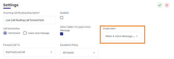 Use the Create an Alert dropdown to choose whether an alert is created when a call comes in, or when a voice message is left.