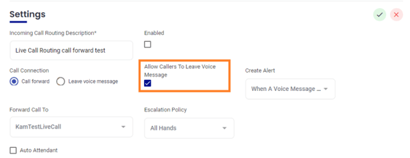 Check Allow Callers To Leave Voice Message to enable callers to leave a voice message to be sent as an alert to the specified group. Leave unchecked to disable voice messages.