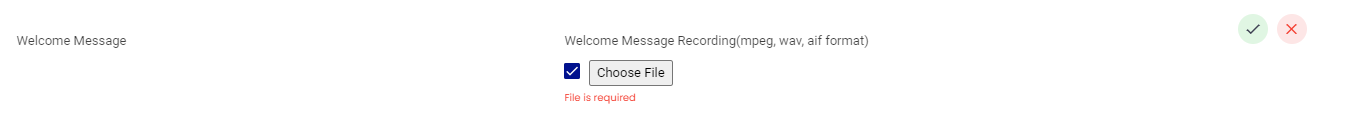 To add a custom recording, check the Welcome Message Recording Box and click the Choose File button to upload your custom recording.