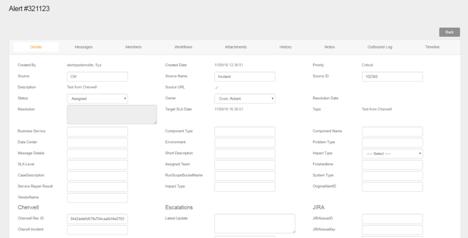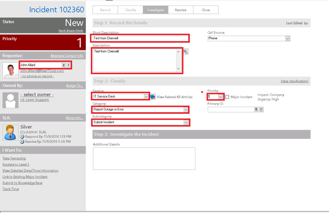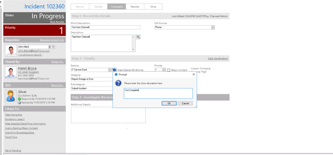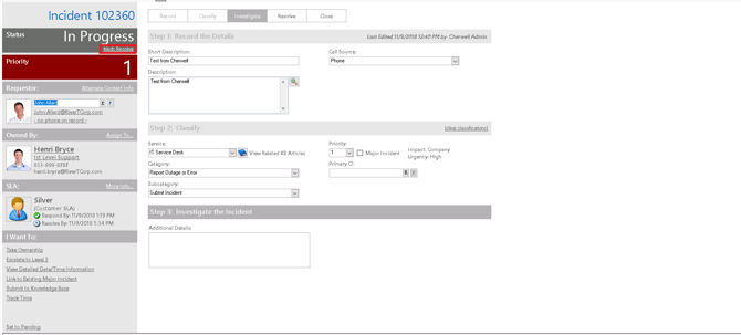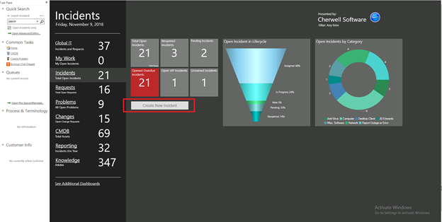 In Cherwell, assign an owner to the Incident and click Begin Work.