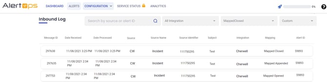 Go to Inbound Messages Log in AlertOps. Verify that the Incident has been received from Cherwell.