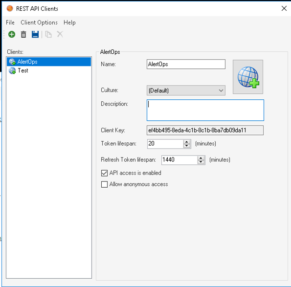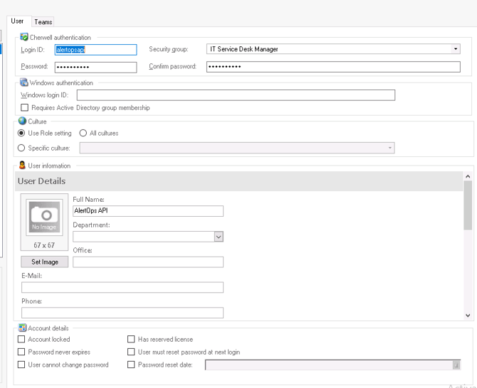The Client ID and the api_key (in the login url) is both the Client Key from the Cherwell REST API AlertOps client. The segment of the Login URL which precedes the /CherwellAPI segment are your Cherwell instance domain path. Enter the Cherwell AlertOps API username and password.