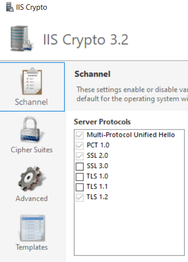 - Ensure that from IIS protocols, only TLS 1.2 is enabled and all prior versions (TLS 1.0, TLS 1.1) are disabled on the server. And that IIS settings are configured per IIS best practice and the server is restarted after configuration.