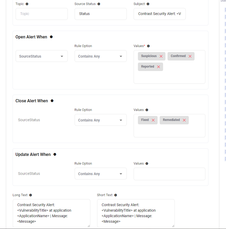 AlertOps will automatically create an incident when a new alert is received from Contrast Security when the Status contains "Suspicious/Confirmed/Reported"
