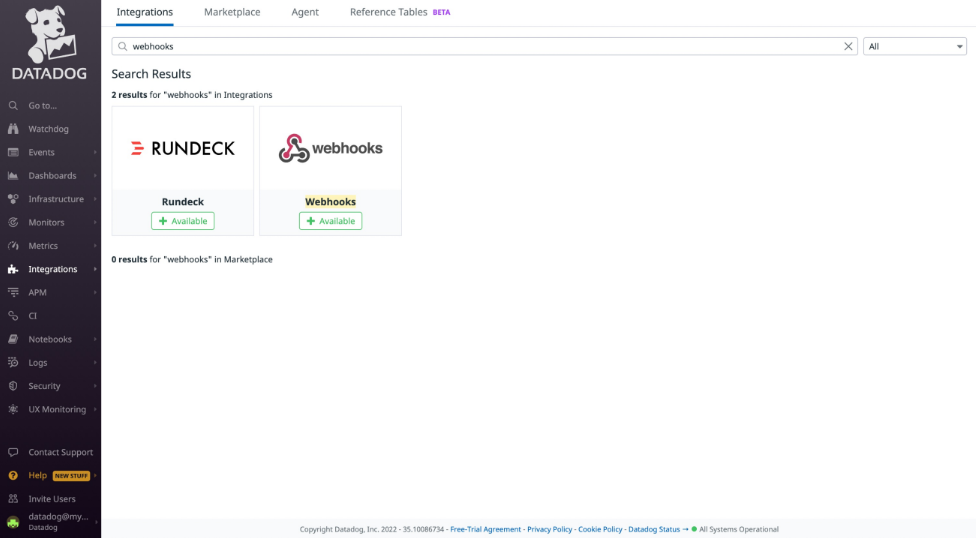 - From the menu on the left, go to Integrations -> Integrations. Search for Webhooks from this page, and click the corresponding button.