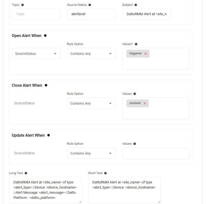 AlertOps will automatically create an incident when a new alert is received from DattoRMM when the alertlevel contains "triggered".