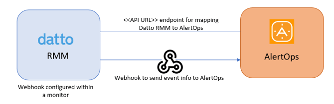 At a high level this is how the flow looks like, you define an API integration in the AlertOps platform by defining settings like Integration Name, Escalation rules, recipient users/groups. Once an integration is defined, a unique API URL is generated. This acts as webhook or the gateway through which notifications from DattoRMM reach AlertOps and thus an incident/alert is created correspondingly. The API can be defined with various settings like URL mappings, filters, escalations etc. as required. DattoRMM has to be defined with a webhook within the response section of a monitor.