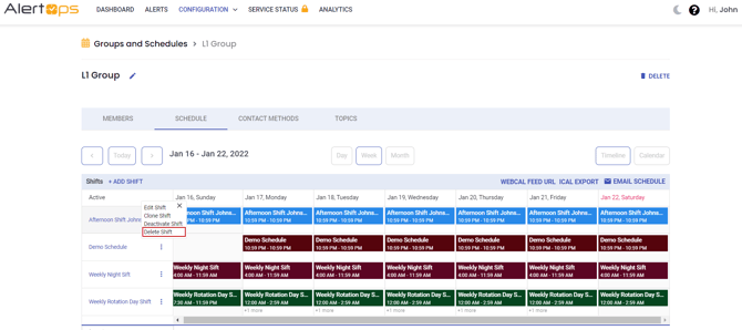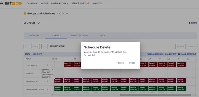 December 3, 2025 Delete Schedule Navigate to Configuration -> Groups & Schedules Select a corresponding group and click the Schedules tab. Under Active, click the Delete Shift wish to remove. Click Delete to confirm