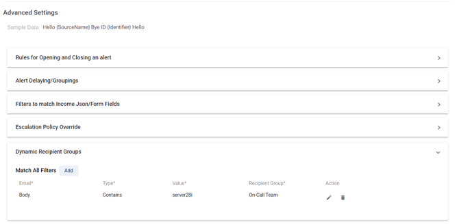In API Integrations, Dynamic Recipient Groups allow routing alerts to a specific group based on a field value in the incoming JSON containing certain text or match a certain Regex. Upon meeting that condition, AlertOps will route to the designated Recipient Groups (in this case, the On-Call Team)
