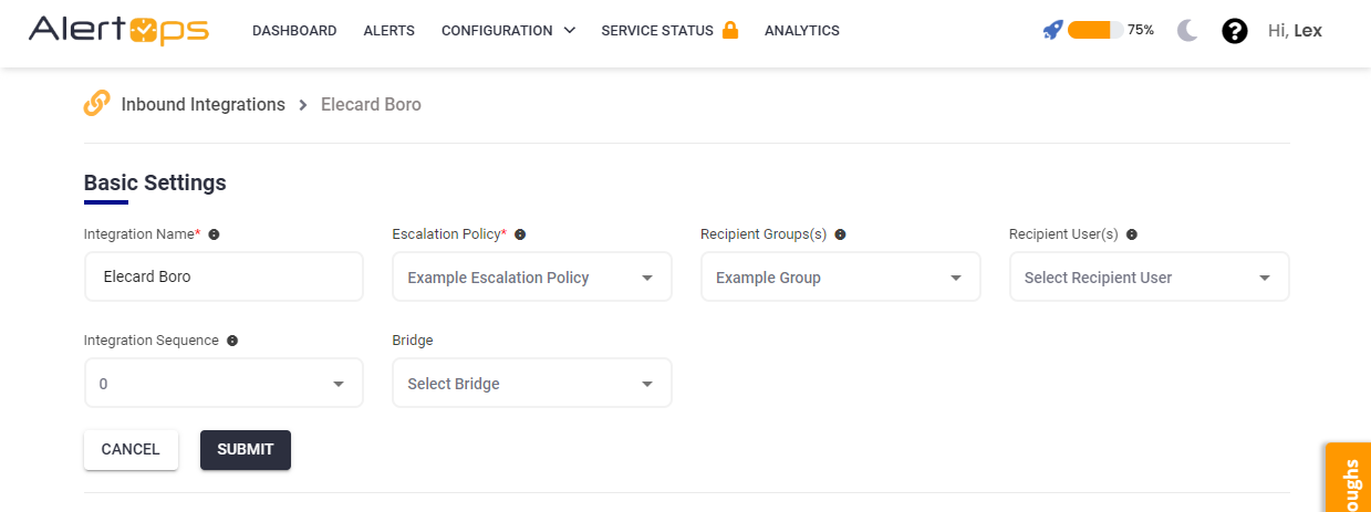 - Once you selected the integration, you can then specify basic settings like the integration name, escalation policy, names of the recipients/groups for which the alerts must be assigned to.