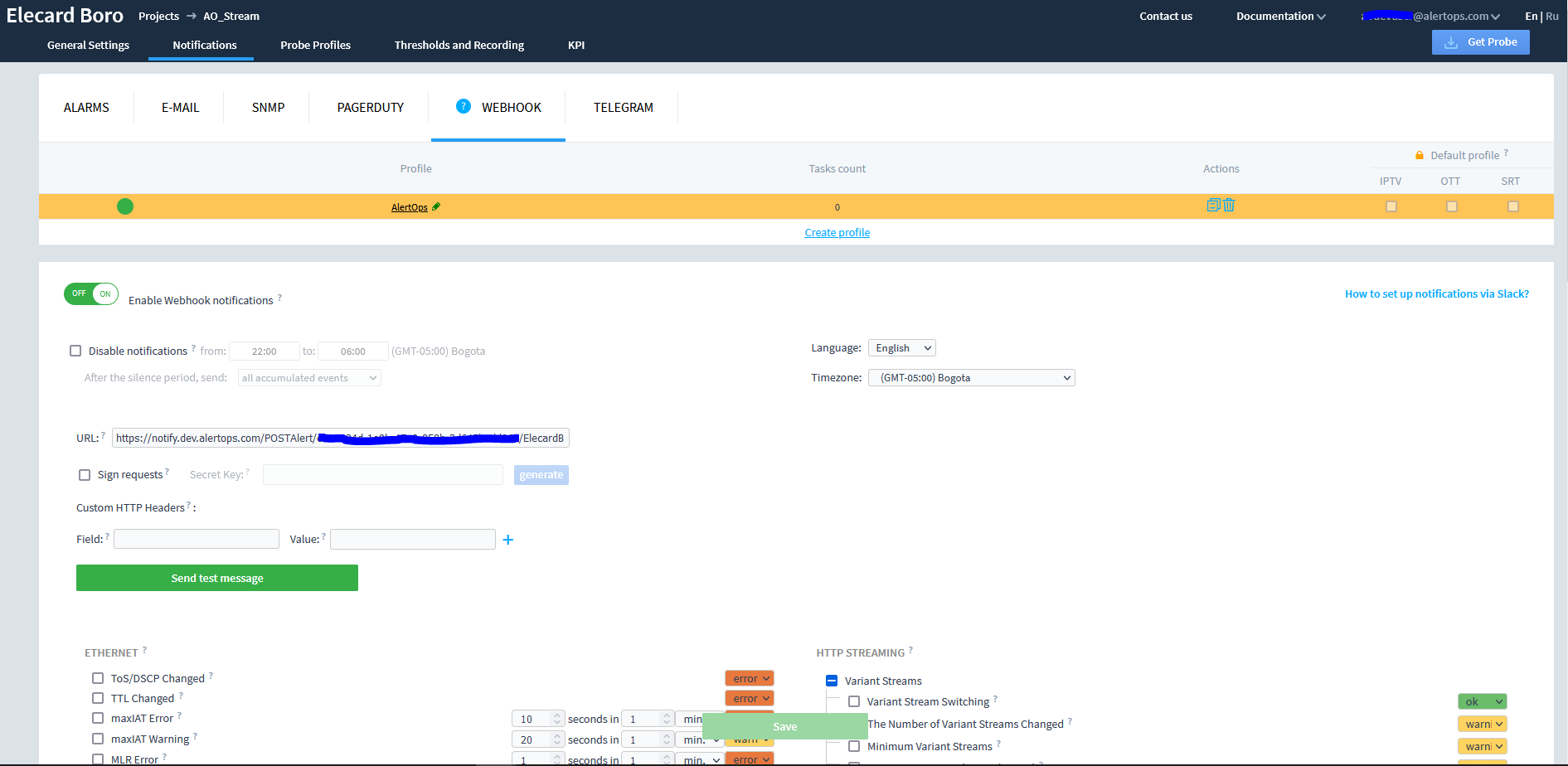 The above scenario and scope for integration is due to the fact that AlertOps has a very flexible and simple API/Webhook configuration feature that can be leveraged with Elecard Boro's alert and notification capabilities.