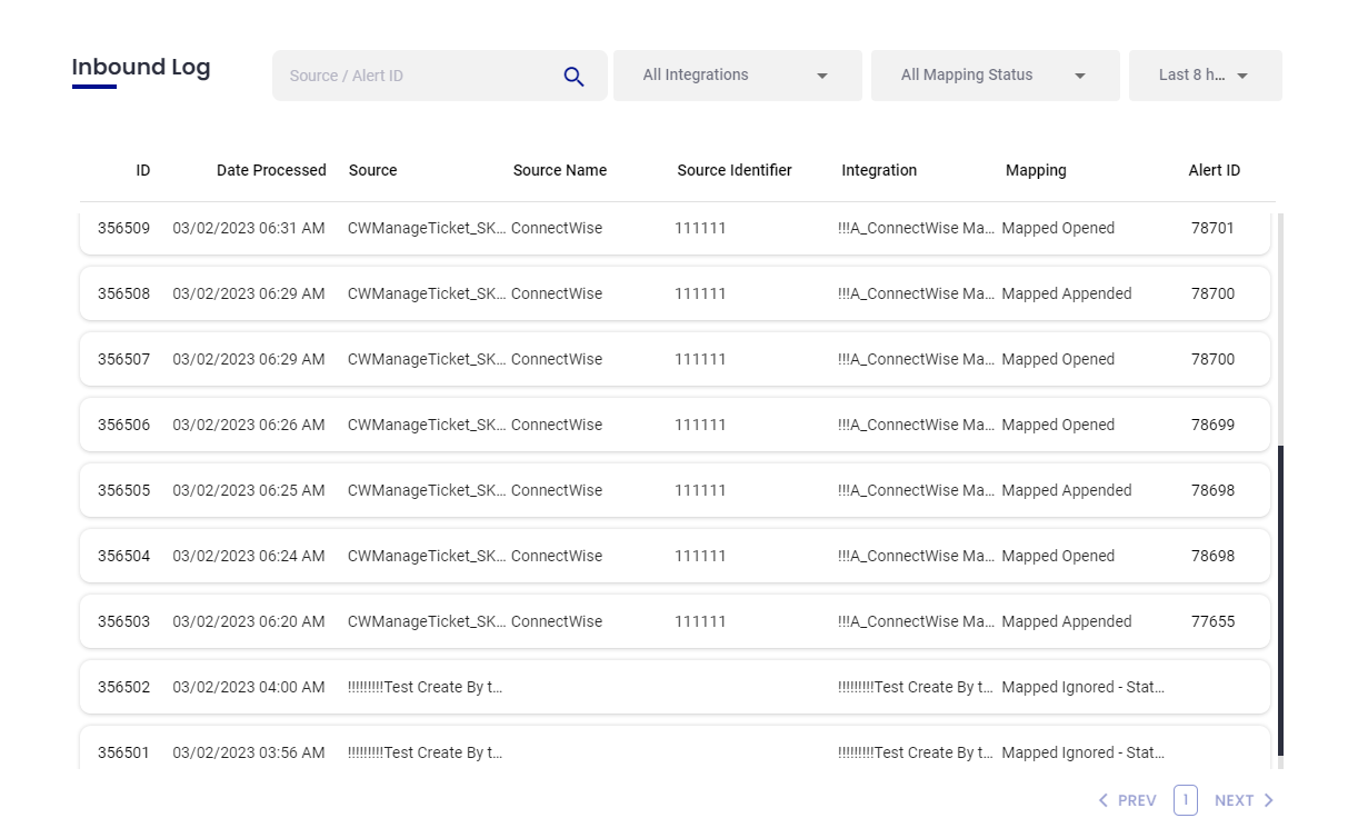 Use the Inbound Log to view all incoming alerts. This can be found at the bottom of the Integrations page.