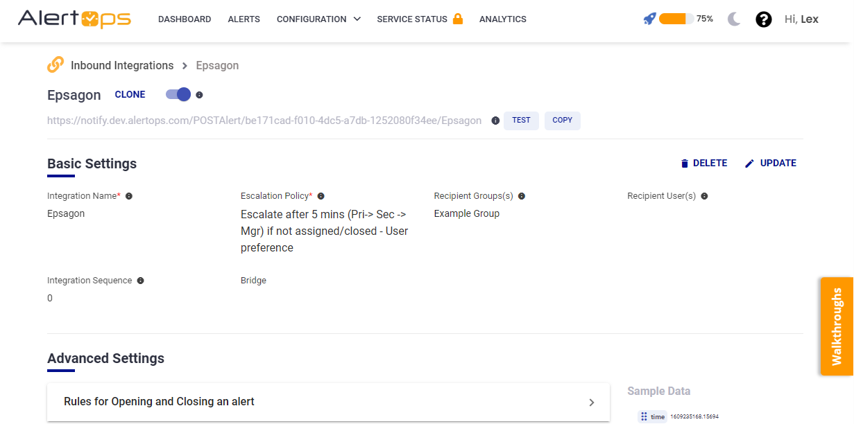 - Once you click save, the API Integration will be created, and you will be given a unique URL which acts as the access point and needs to be configured at the source (in this case Epsagon), to send alerts. You can find the integration you just created, and you can give advanced settings and define various configurations for the alerts to be received and processed. For example, you can define when to open and close alerts based on the payload obtained from the API call, filters etc.
