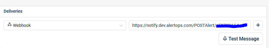 - Under 'Deliveries' select 'Webhook' from the dropdown and paste the AlertOps Inbound Integration API URL. You can send a Test Message to see if the webhook goes through.