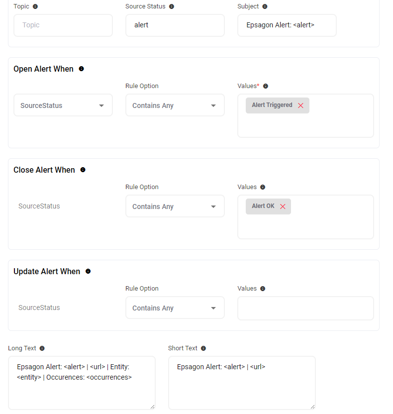 AlertOps will automatically create an incident when a new alert is received from Epsagon when the alert contains "Alert Triggered".